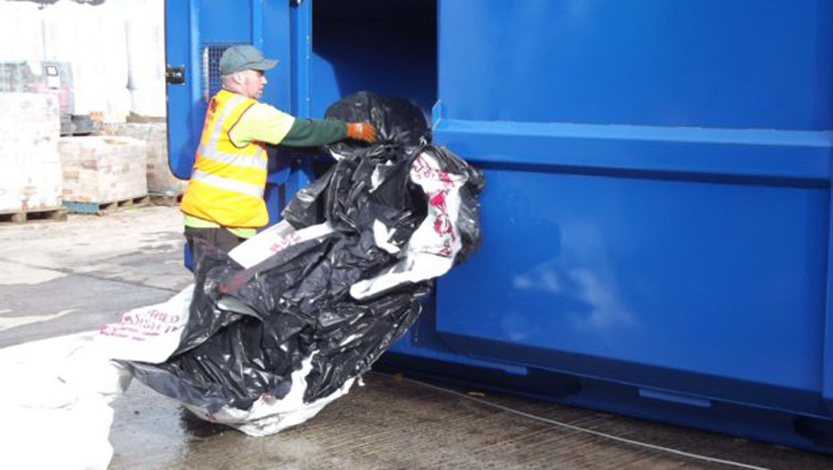 Loading doors located to both sides together with a large front/top loading door suitable for tipping skips.